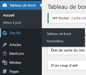 Une fois connecté(e), en haut à gauche de l’écran, maintenir votre souris sur « Site Kit » puis cliquer sur « Tableau de Bord ».