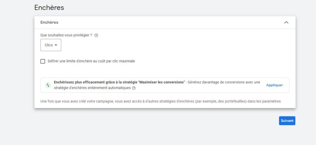 Dans un premier temps on privilégie toujours les clics car la mesure des conversions n’est pas en place et on a pas encore suffisamment de donnés pour que ça soit efficace.