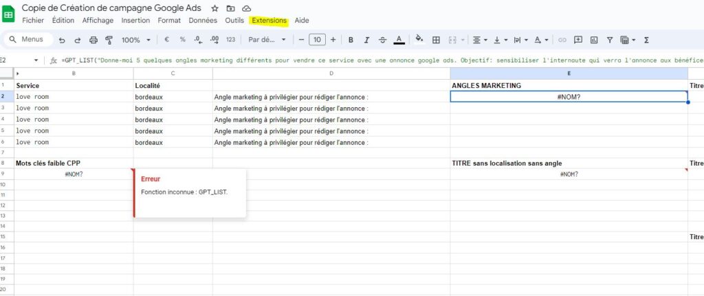 Activez la fonction avec Chat GPT: cliquer sur extension puis chat GPT for sheets and docs puis enable chat gpt.