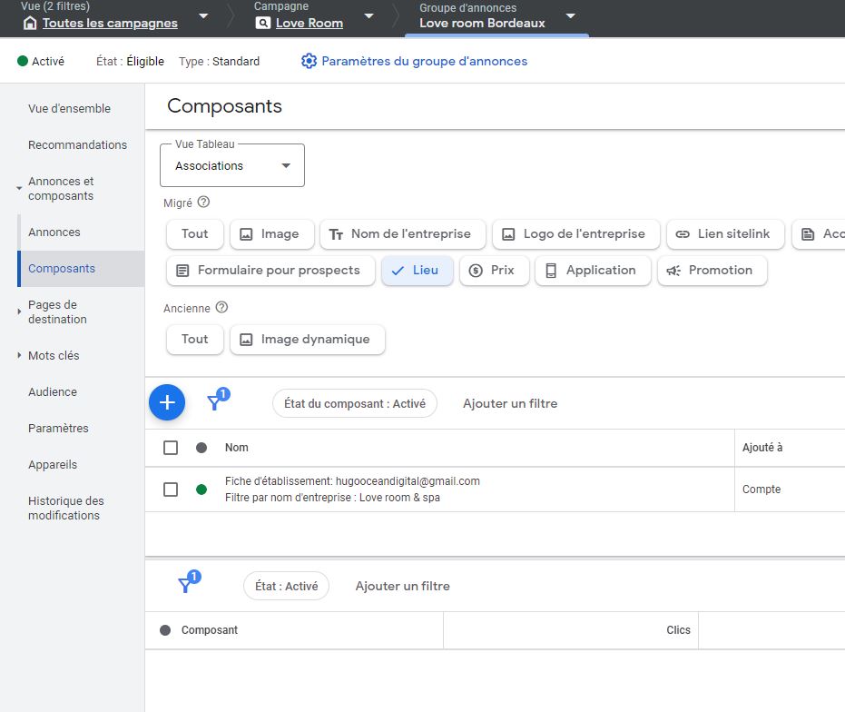 Dans le groupe d’annonces, ajouter le composant lieu en sélectionnant la bonne fiche du compte My Business de l’agence. On peut utiliser le filtre par nom d’entreprise.