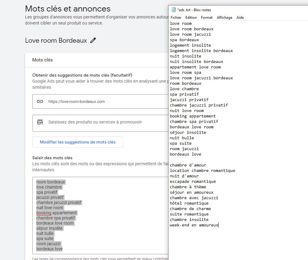 On laisse cet onglet ouvert et on va créer la bonne liste de mots clés dans un fichier à côté avant de remettre les bons. Ouvrez un fichier txt tout simple et collez la liste de mots clés.