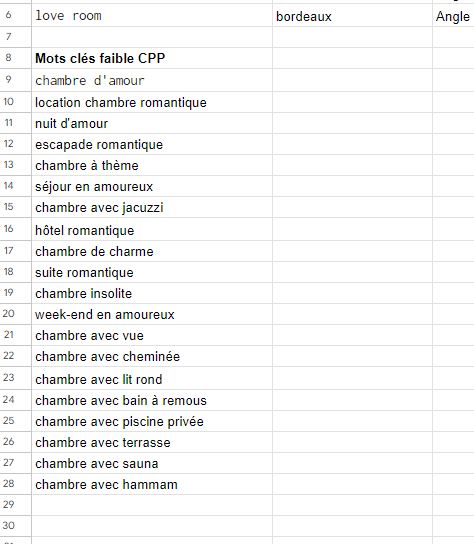 Copiez collez les mots clés avec un faible CPP que vous trouvez pertinent dans le fichier txt en plus des mots clés proposés par Google précédemment :