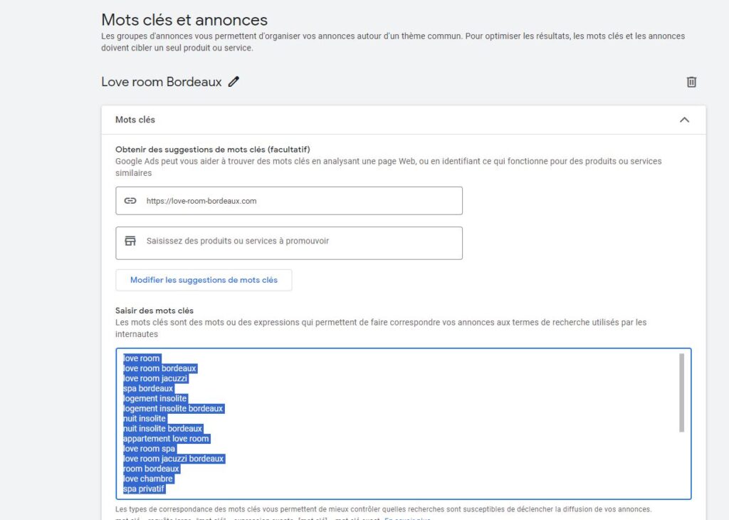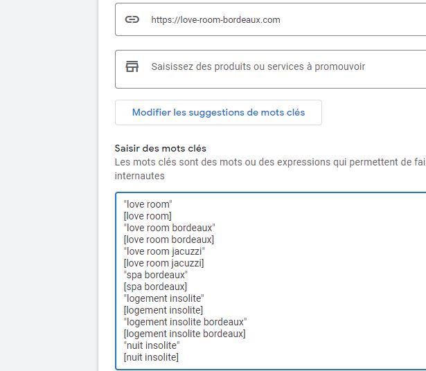 Les mots clés proposés sont des requêtes larges, ce qui n’est pas idéal. On peut tout de même les copier coller car ils ont été généré en fonction du site et normalement c’est assez pertinent.