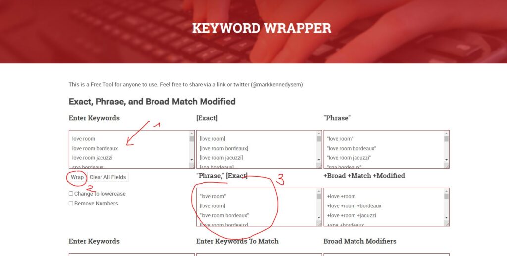 On va utiliser un outil en ligne pour les modifier, https://searchenginesmarketer.com/company/resources/keyword-wrapper/ ou un outil equivalent.
