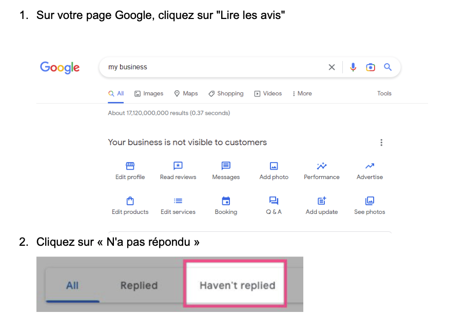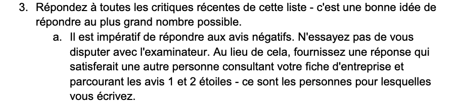 Note : la première fois que vous optimisez cette liste, vous devrez essayer de répondre à tous les avis sans réponse que l’entreprise a actuellement (le cas échéant). Une fois cette première série de réponses terminée, il est recommandé de répondre aux nouveaux avis au fur et à mesure qu’ils arrivent (consultez la section surgérer les paramètres du profil d’entreprise Googlepour configurer des notifications pour les nouveaux avis.)