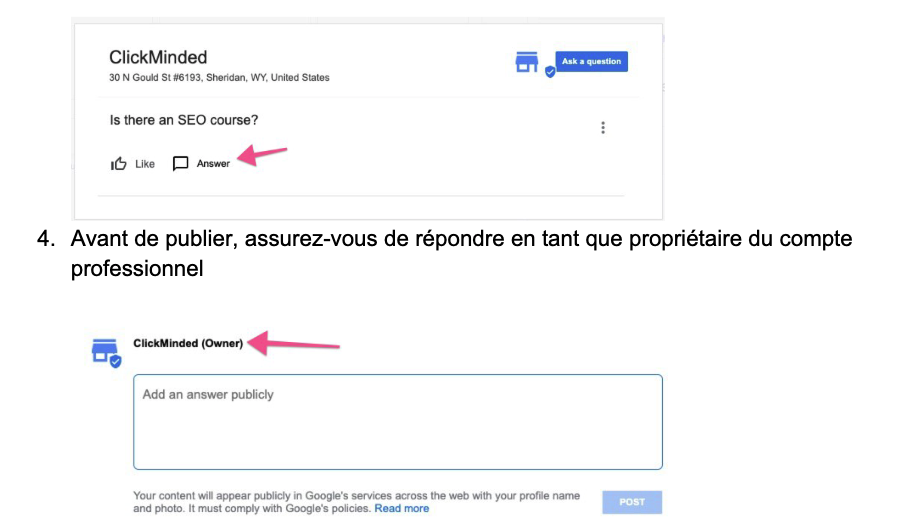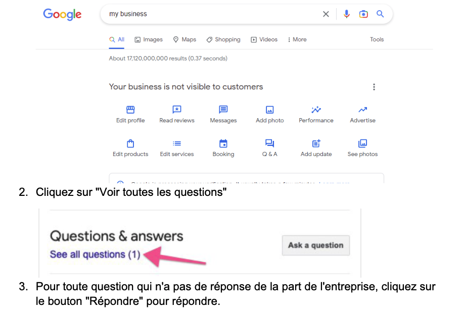 Note : la première fois que vous optimisez cette fiche, vous devrez répondre à toutes les questions sans réponse de l’entreprise, le cas échéant. Une fois cette première série de réponses terminée, il est recommandé de répondre aux nouvelles questions au fur et à mesure (consultez la section surgérer les paramètres du profil d’entreprise Google pour configurer des notifications pour les nouvelles questions.)